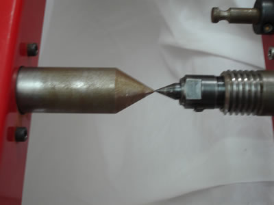 4. Slide the tailstock back and check the final alignment. Install a dead center in the spindle. Slide the tailstock back up to the headstock, and the two points should match up reasonably well. If not, try the above steps a second time.