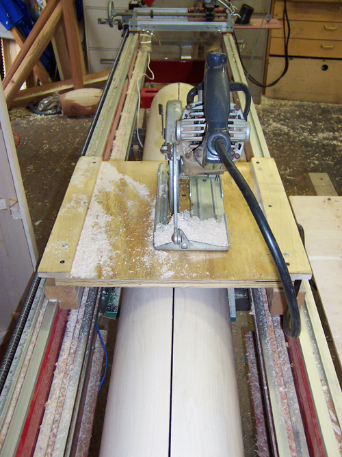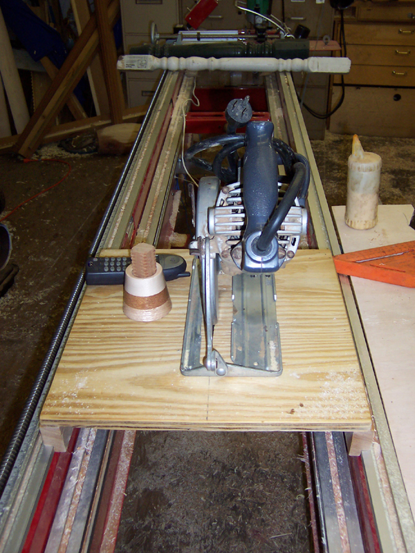 This is the saw jig I use to cut hollow columns in half or quarters. The left side of the saw blade is on the centerline if both tailstock and head stock. The saw is screwed in place and the kerf in the sled is just slightly larger than blade width. I use a 60 tooth carbide blade.