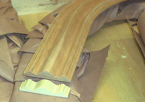 Then I make a table fixture on the center bars of the legacy. This fixture will have a track made of more MDF (love that stuff) and a couple of feather boards to keep you honest. Use a piece of the straight, off the shelf molding or one that you have created for the job and set each pass up with a router bit that best matches the sample piece. After multiple passes and bits, a little touch up sanding and a moment of pride is in order. I am sending a pic of some more molding and another jig that I came up with to further change the angle of the z axis. Also will send a pic of a curved 7-1/2", 13" radius, Ash hand rail that was made the jig and the center table tracks.