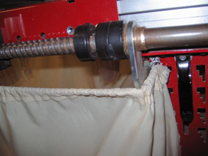 Tie a knot (I used a figure-8 knot) in the ends of the rear bungee cord, lower the bed, and insert the bungee cord in the outer rail as seen in the picture. This bungee needs to be tight, as this one won’t be moved. The curtain will hang from between the two rails (the bungee should sit inside the outer rail) where it shouldn’t interfere with template mounting or moving the rails up or down. I used a bit of coat-hanger wire formed into a hook for the front bungee, but I think the bungee can just be pushed through the holes at the top of the rail-legs and knotted. This bungee needs to be just short enough to hold up the curtain so you have enough stretch to easily pull it down and reach through. Note that the curtain runs outside the Acme screw supports, this makes reaching in easier.