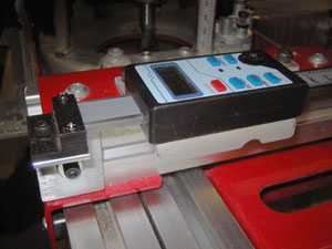 I finally mounted a digital gage on the Y-axis of my Legacy 900. I got a 12" gage from eBay (search for "digital vertical" in business), it has about 12 3/4" of movement, relative or absolute measurement in inches or millimeters. I’ve set the absolute to zero at the centerline of the headstock. Mounting it was easy: I used 1/8” aluminum that I already had.