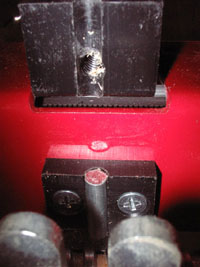 The first picture is both parts of the split nut - you can see the chamfered holes on the back (where the flat head Philips screws mount it to the sled) behind the steel pin. The two holes on the right are where the aluminum fork (that the knob slides on) mounts on. The single hole on the left is where the locking knob screws in. Note that the aluminum piece on the bottom of the picture was just to provide support while taking the picture.