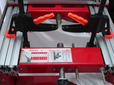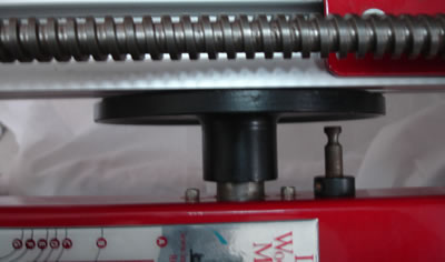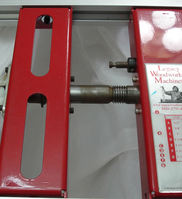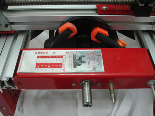 The other test that is simple to do is use a large face plate to check if the spindle is true in relation to the Y-axis. I would recommend a 1" shaft collar be used to mount the faceplate (not shown). Please see my note on mounting faceplates. With the bed fully raised, slide the carrier tray up against the face plate and look down at the gap between the aluminum rails and the face plate. There should be no visible gap. This verifies that the router is parallel to the face plate. Rotating the spindle a quarter turn should prove true as well.