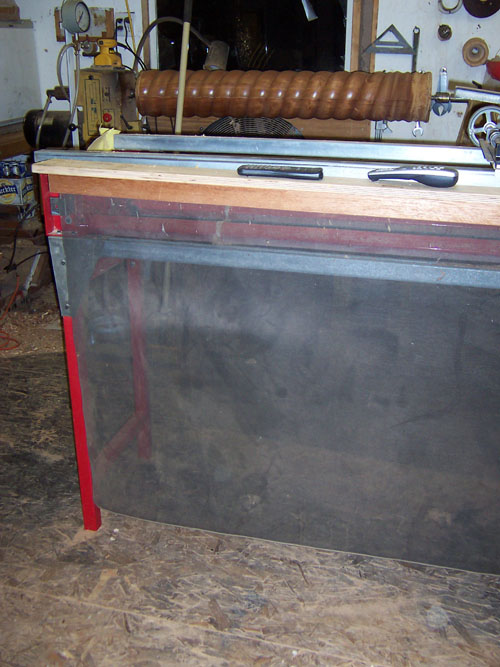 This is my solution for reducing the shavings being thrown all over the shop. I just used the plastic mesh window screen mounted to the top rail. The dust bag by Legacy doesn't fit my shop because I use the 30" fan mounted in the wall behind my lathe for ducting dust outside. This setup catches 99% of the chips and doesn't get in the way when sweeping up.. |