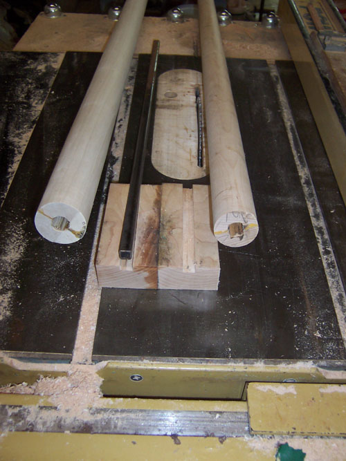 I had an order for some 2" by 48"stain grade dowels. Normally I would have used a steady rest but I wanted to see if I could do them without a steady rest with the idea of being able to do the same on the Legacy. I glued up the blanks with a 1/2" square tubing in the center. The tubing had been wire brushed and then worked over with steel wool and Johnson's paste wax to keep the glue from sticking to it. The 1 1/2" one on the right had a fair amount of whip and the 2" one on the left was a lot better but still had too much whip for the Legacy. I was able to turn the 2" one at about 1500 RPM and keep the tolerance within 1/32". I believe that using 3/4" tubing would be better for the lathe and 1" would work on the Legacy for pieces 3" by 6'. . |