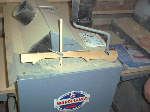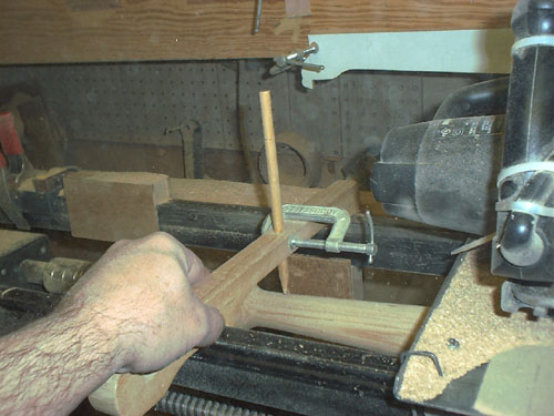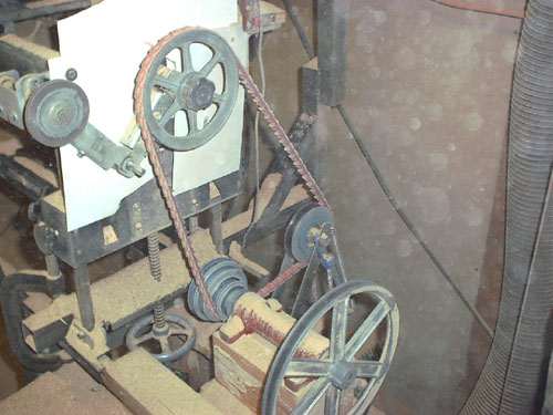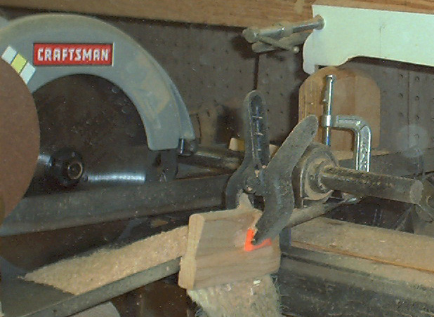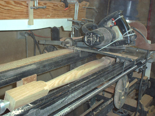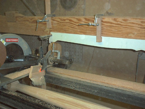 Mike Pung I bough a Vega duplicator which is supposed to be the best on the market and got rid of it . This appears far superior and cheaper. It is my next project after Mike's sander. This is Mike's radial lathe. Saw is mounted on the angle iron which extends past the pivot point and the stop block is clamped to the angle iron. Saw is angled about 1 degree into direction of cut and both saw blade and stock rotate in the same direction so there is more of a shear cut. By varying the height of the stop block and the height of the template the saw will cut to within 1/16" of final dimensions on these oak spindles.