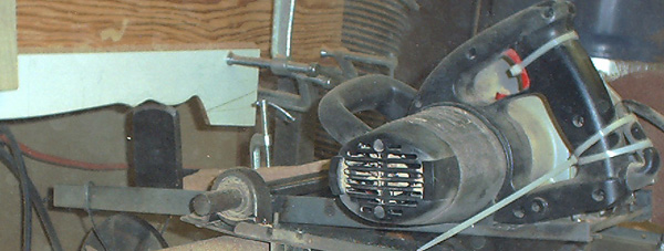 Here is the drive mechanics for the stock which rotates independent of the saw travel. Mike, I assume that a motor drives this. I guess that you are using a 1/2 HP washing machine motor . Belted pulleys appear to be a 4 to 1 reduction. If I am correct and the motor with a 2" pulley drives the large pulley then there is a further 5 to 1 reduction giving a stock speed of 88 RPM.