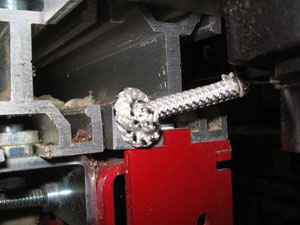 Tie a knot (I used a figure-8 knot) in the ends of the rear bungee cord, lower the bed, and insert the bungee cord in the outer rail as seen in the picture. This bungee needs to be tight, as this one won’t be moved. The curtain will hang from between the two rails (the bungee should sit inside the outer rail) where it shouldn’t interfere with template mounting or moving the rails up or down. I used a bit of coat-hanger wire formed into a hook for the front bungee, but I think the bungee can just be pushed through the holes at the top of the rail-legs and knotted. This bungee needs to be just short enough to hold up the curtain so you have enough stretch to easily pull it down and reach through. Note that the curtain runs outside the Acme screw supports, this makes reaching in easier.