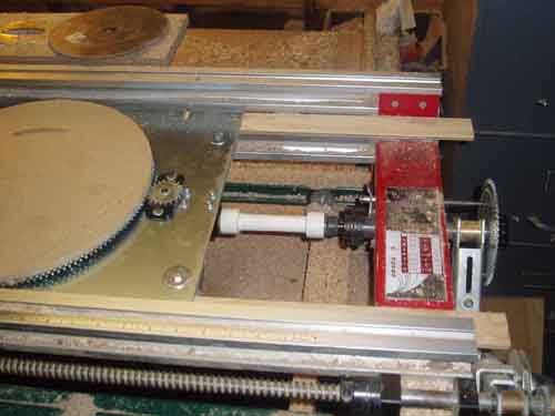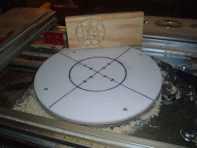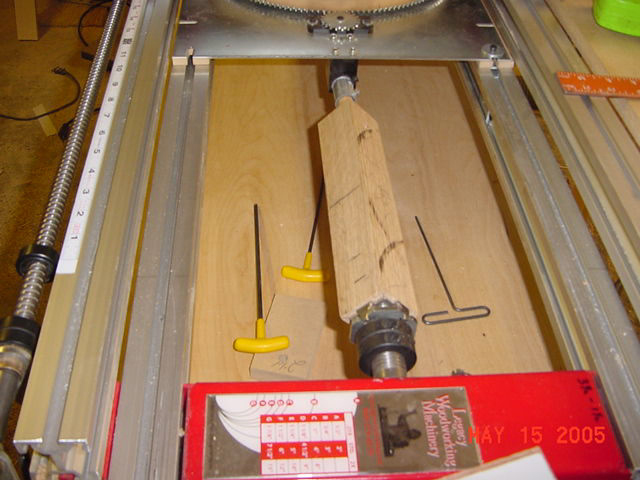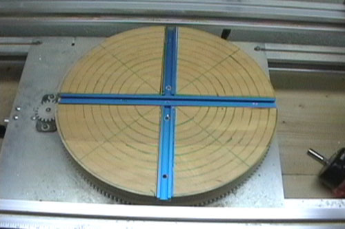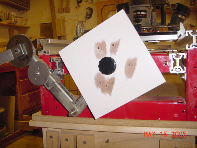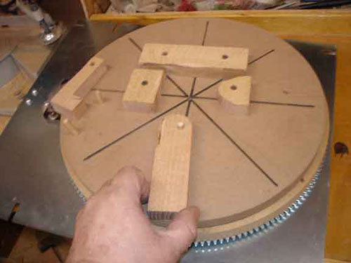 First I am from Bloomington Il. I have been learning from everybody on this forum. The first picture is the way I hooked up the table to my head stock. I use different tables for each thing I do on the table. I just use 1/4" pins to line everything up. The second picture shows that I am making new indexing plates. This one is for 15 degree and 22 1/2 degree spacing. They are made out of 1/8" hard board. The next two pictures are of the way I hold down my rosettes. In the bottom there is a screw through the plywood with just a small tip through to pin the rosette when I lock the arm in. I would like say that I really enjoy this forum and wish that we could all meet sometime. I have been woodworking for about 20 years as a second income. I work for (now don't laugh) The Town Of Normal, Illinois. My hours are am-12pm Tuesday thru Friday so this gives me time to do my woodworking. For the last 6 years I have been doing a lot of kitchens and am tired of doing them. So with my Legacy I am trying something different. OK enough rambling time to relax.